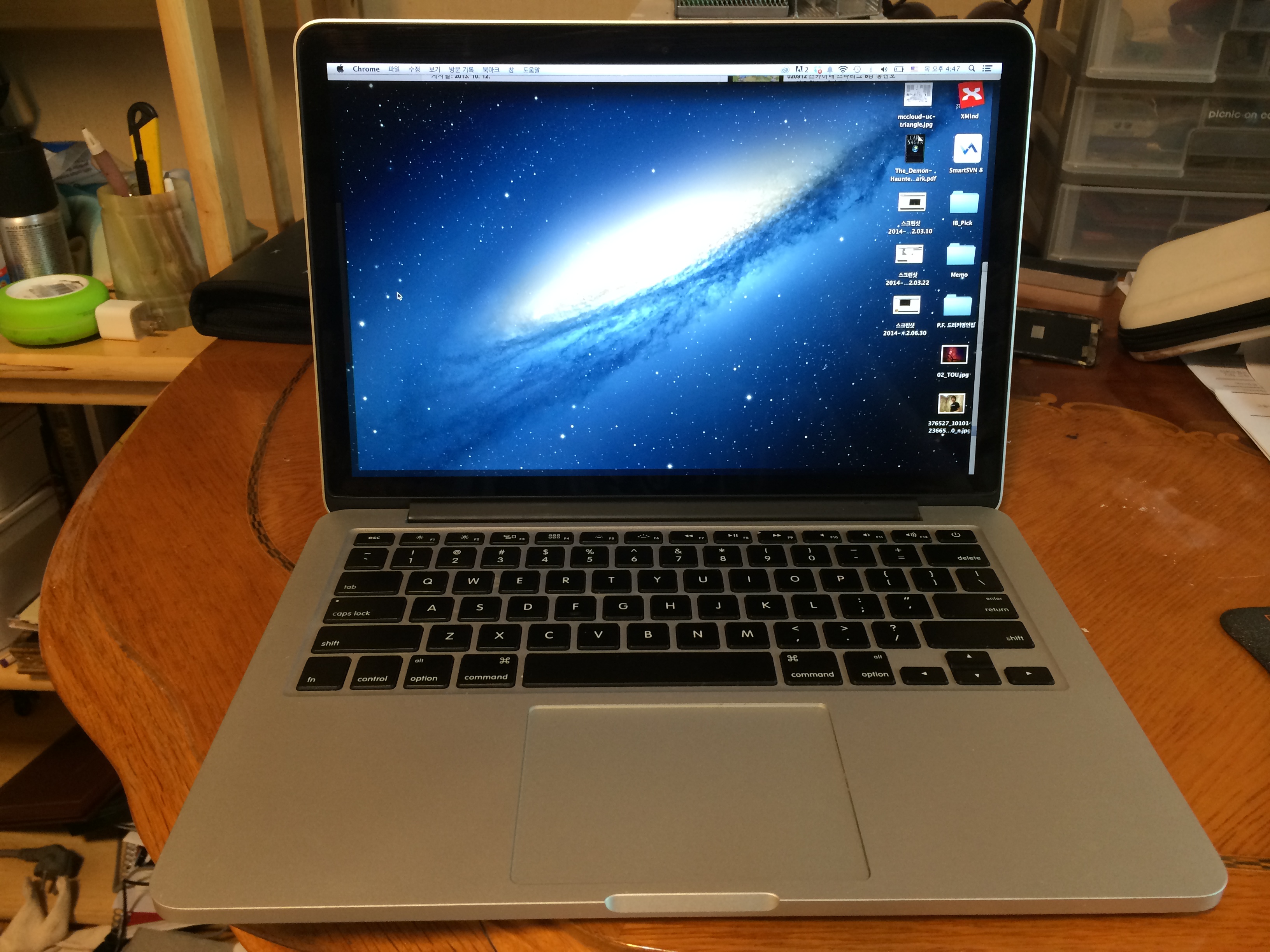 작년 말에 미국에서 산 맥북 프로 레티나 13인치 모델입니다. 좀 써봤으나 맥 OS에 적응 못하고 다시 윈도우로 돌아가려고 합니다.